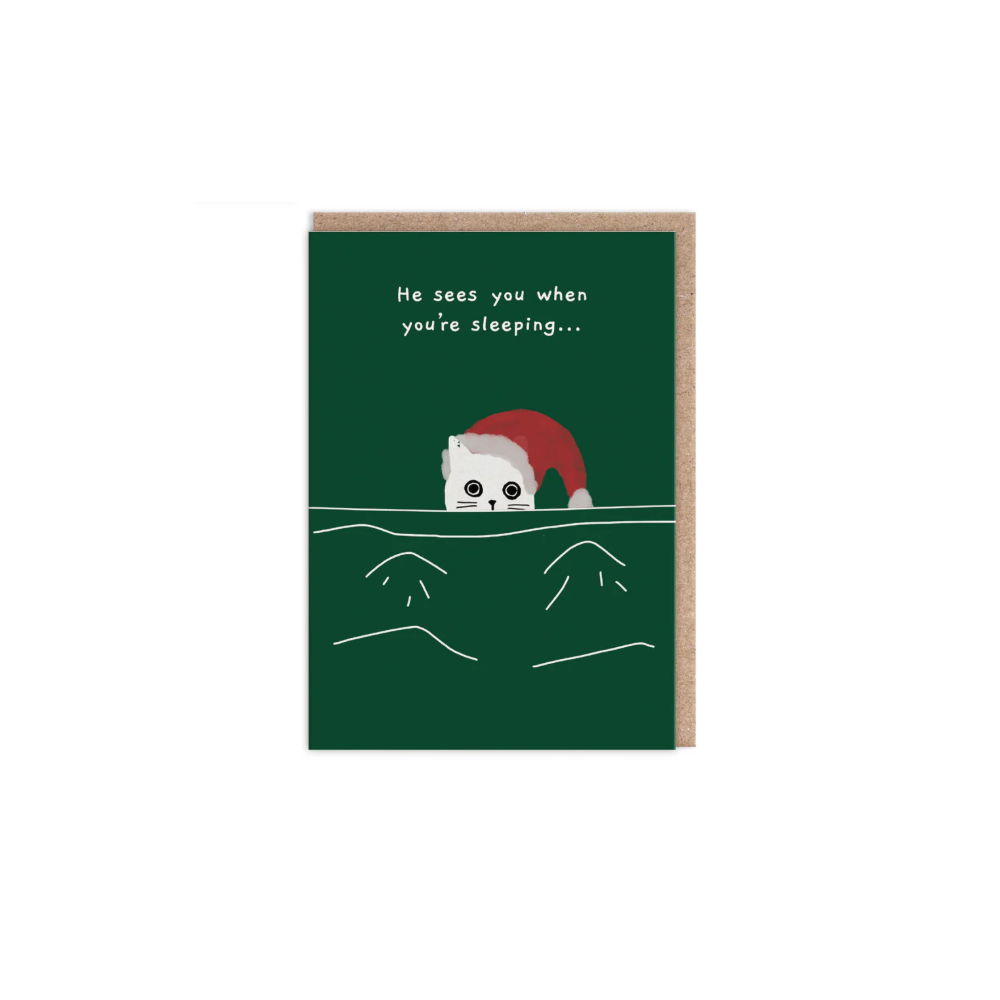 Know anyone who complains about their cat staring at them while they’re sleeping? The He Sees You When You're Sleeping Cat Christmas Card is perfect for them. Wish them a meowy Christmas with a dash of humour.